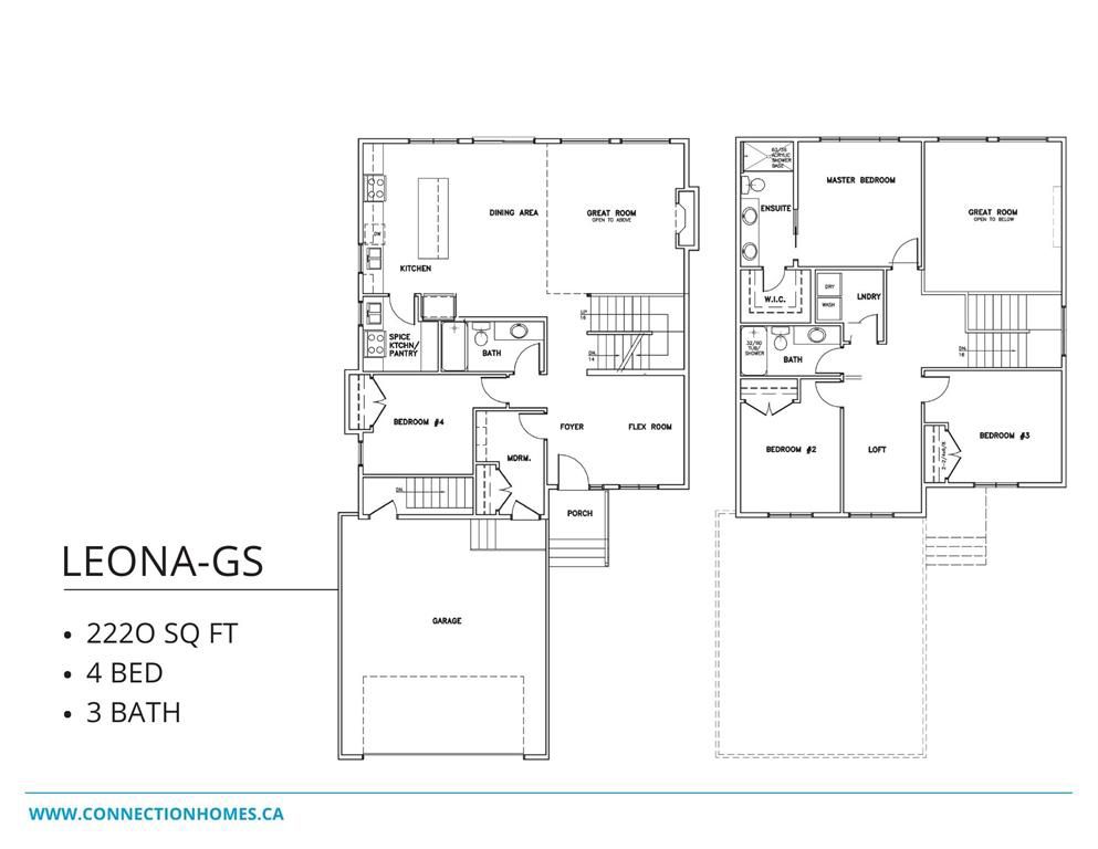 Welcome to the Leona by Connection Homes, an impressive 2,220 SqFt two-storey designed for modern family living with a bright and spacious layout. The main floor features a welcoming foyer, versatile flex room, and a functional mudroom with access to the large 24.8' x 21' double attached garage. The heart of the home offers an open-concept design with a stunning great room with open-to-below ceiling, creating a bright and airy living space. The kitchen is beautifully finished with quartz countertops, ample cabinetry, and a separate spice kitchen, flowing seamlessly into the dining area—perfect for everyday living and entertaining. Upstairs you’ll find a spacious primary bedroom with a private ensuite featuring double vanity and standing shower, along with two additional generous bedrooms, a versatile loft area, and a full bathroom. Built by Connection Homes, known for quality craftsmanship and thoughtful design. Central air conditioning is included for added summer comfort. House plans are available in supplements and buyers can select finishes at the design centre.